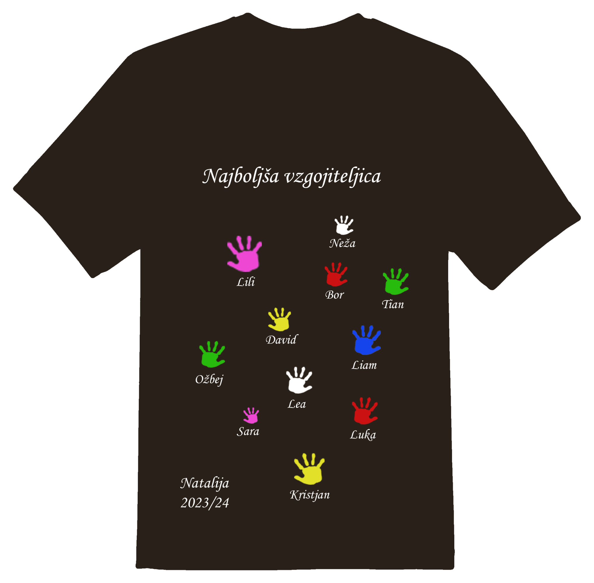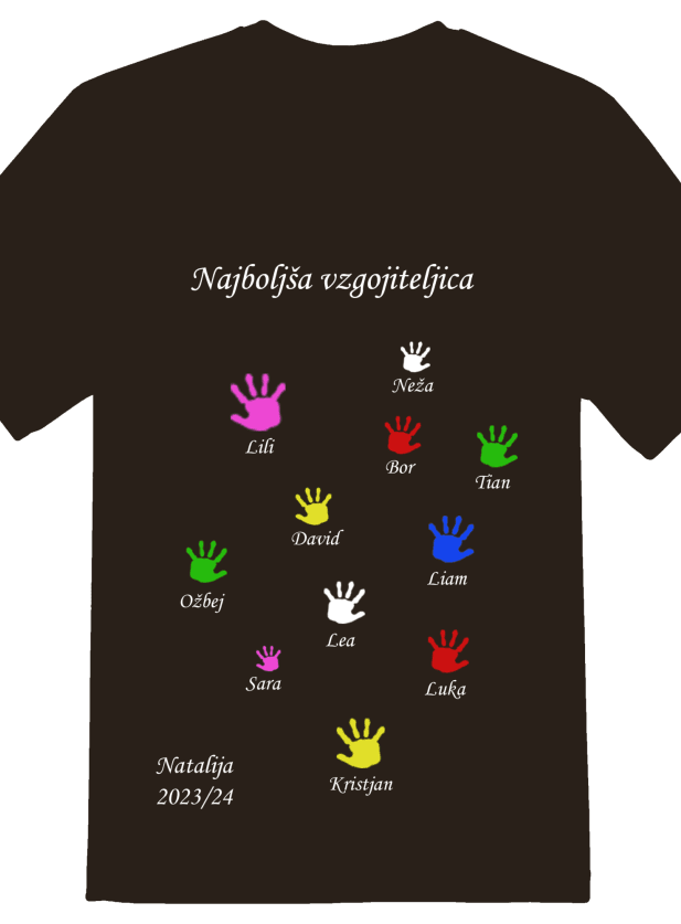 Na majici je prikupna slikanica z imeni otrok v skupini in imenom vzojitelja-ice, učitelja-ice.