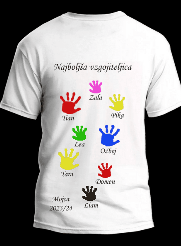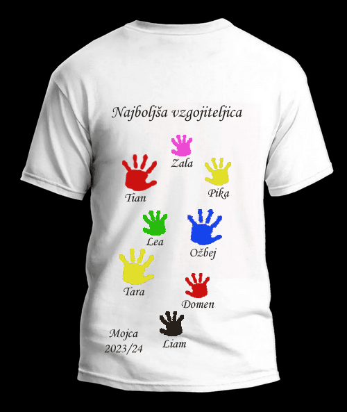 Na majici je prikupna slikanica z imeni otrok v skupini in imenom vzojitelja-ice, učitelja-ice.